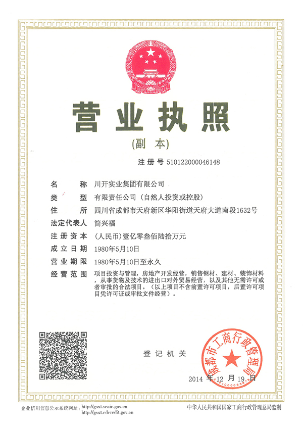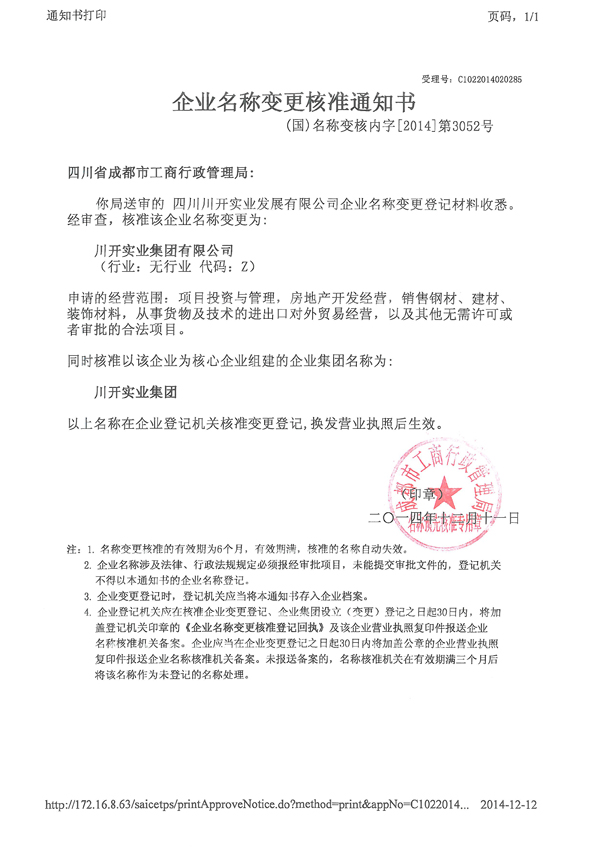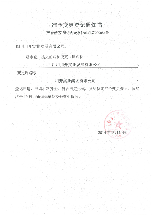 為了更好適應(yīng)集團運營管理需要,經(jīng)國家工商行政管理總局核準(zhǔn),成都市工商行政管理局受理批準(zhǔn),“四川川開實業(yè)發(fā)展有限公司”名稱現(xiàn)已變更為“川開實業(yè)集團有限公司”,簡稱“川開實業(yè)集團”。