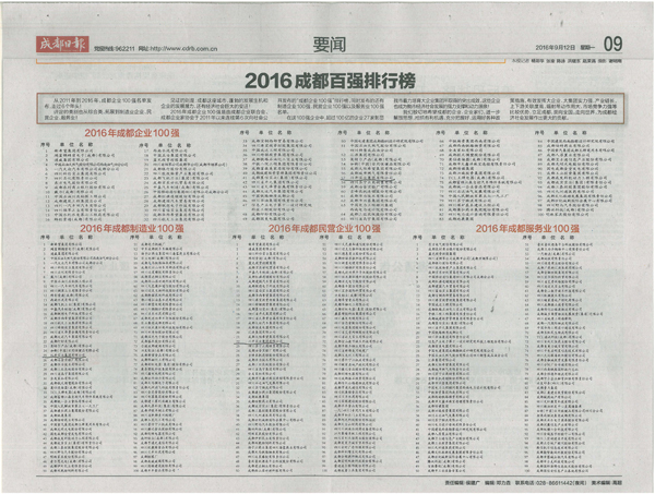 近日,從成都企業(yè)聯(lián)合會(huì)、成都市工業(yè)經(jīng)濟(jì)聯(lián)合會(huì)發(fā)布“2016成都企業(yè)100強(qiáng)”榜單,我集團(tuán)榮獲“2016年成都企業(yè)100強(qiáng)企業(yè)”(排名57位)、“2016年成都制造業(yè)100強(qiáng)”(排名25位)、“2016年成都民營(yíng)企業(yè)100強(qiáng)”(排名22位)榮譽(yù)稱號(hào)。
