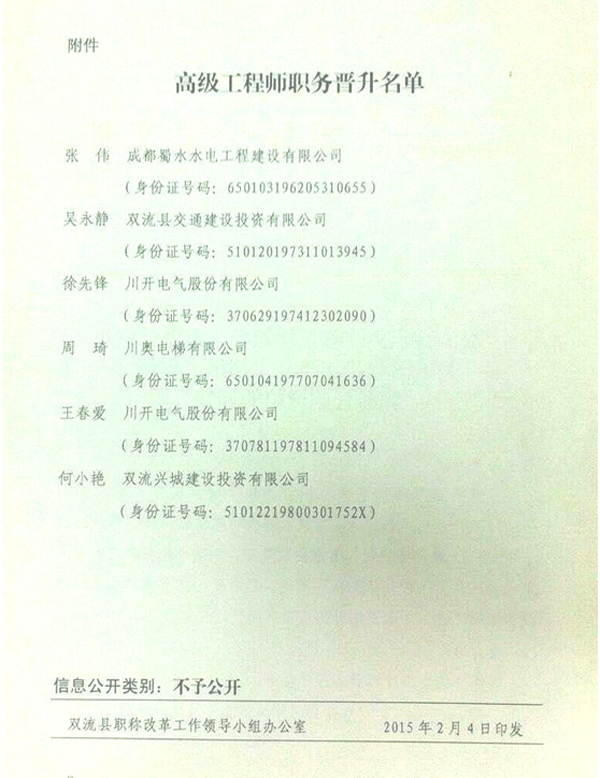 2015年2月4日,雙流縣職稱改革工作領(lǐng)導(dǎo)小組辦公室宣布了“雙流縣職稱改革領(lǐng)導(dǎo)小組辦公室關(guān)于同意張偉等6人高級(jí)工程師職務(wù)任職資格的通知”,其中一半人員為川開集團(tuán)員工,分別為徐先鋒(川開電氣股份)、周琦(川奧電梯)、王春愛(川開電氣股份),熱烈祝賀川開集團(tuán)以上員工順利取得高級(jí)工程師任職資格,并希望集團(tuán)全體員工向徐先鋒等三位同志學(xué)習(xí),在新的一年里以更輝煌的成績譜寫川開新的篇章,為自己的未來譜寫華麗篇章。
